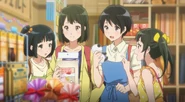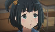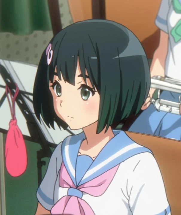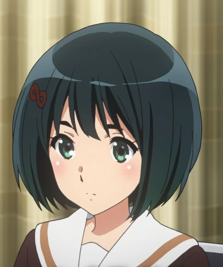 Yoshizawa is a young teenage girl with straight chin-length dark-green hair that she wears in a bobbed hairstyle where there is a piece of her hair tied into a short, upward ponytail tied with an orange scrunchie on the right side of her head. light green eyes, quite thick eyebrows and a short/petite build, who is also the shortest of the minor characters.
