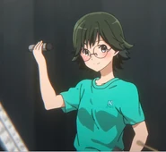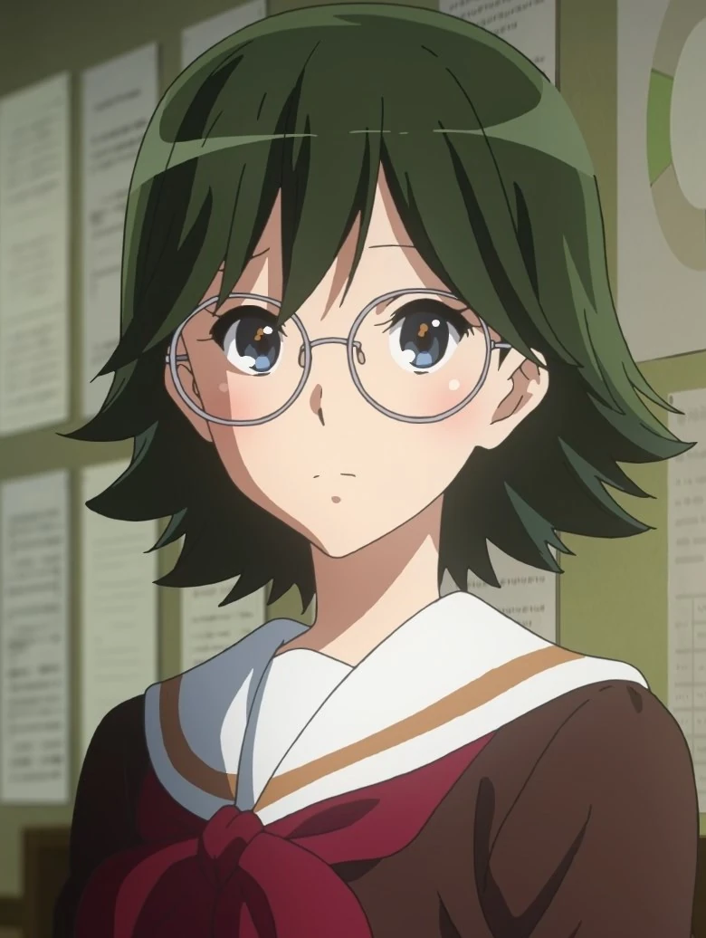 In the light novel, she is described as having short, spiky black hair and black eyes, with rimless glasses.